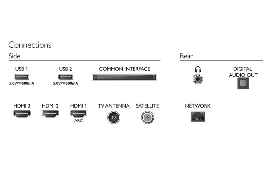 3 HDMI, 2 USB, Satellite Connector, Common Interface Plus (CI+), Digital audio out (optical), Service connector, Headphone out